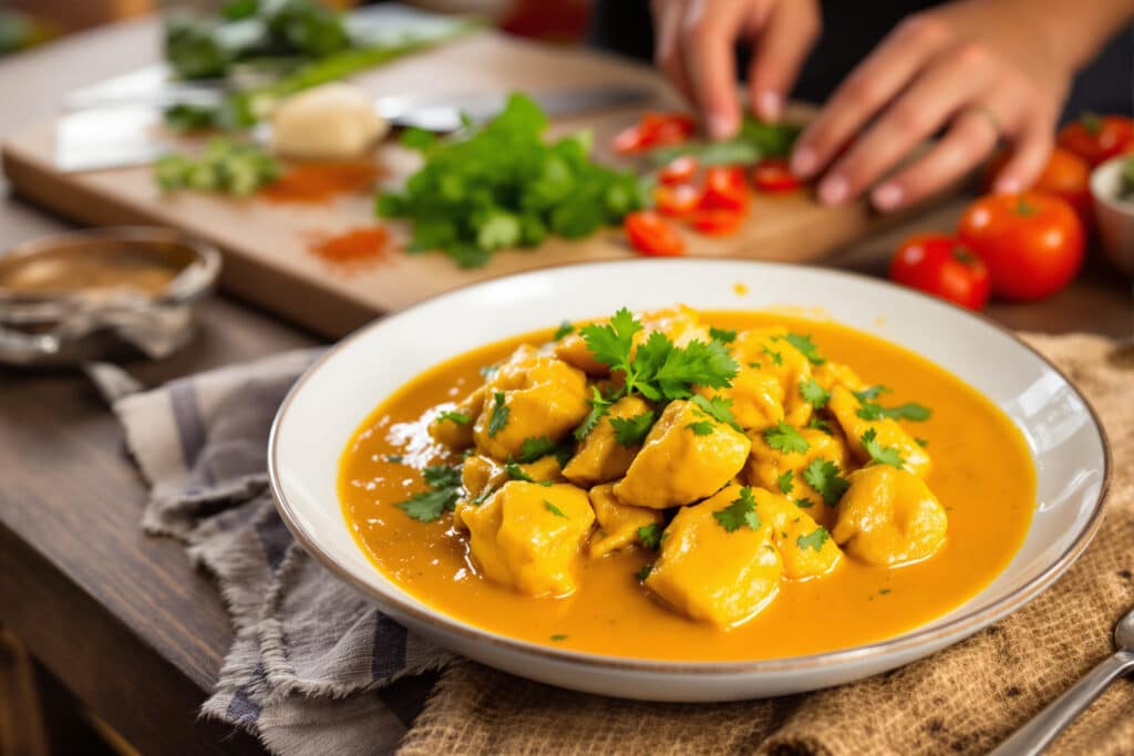 Concernant les légumes, rien de plus simple ni meilleur qu’un oignon doux finement émincé et quelques gousses d’ail pour apporter du fond. Si vous aimez, vous pouvez aussi ajouter du gingembre frais râpé, qui donnera une belle note piquante. La tomate entre en scène ici, sous forme de purée ou de concassé, pour apporter du corps et de la rondeur au curry. Enfin, la touche finale vient souvent avec un peu de lait de coco — optionnelle mais tellement douce ! — qui adoucit les épices et donne une texture onctueuse.