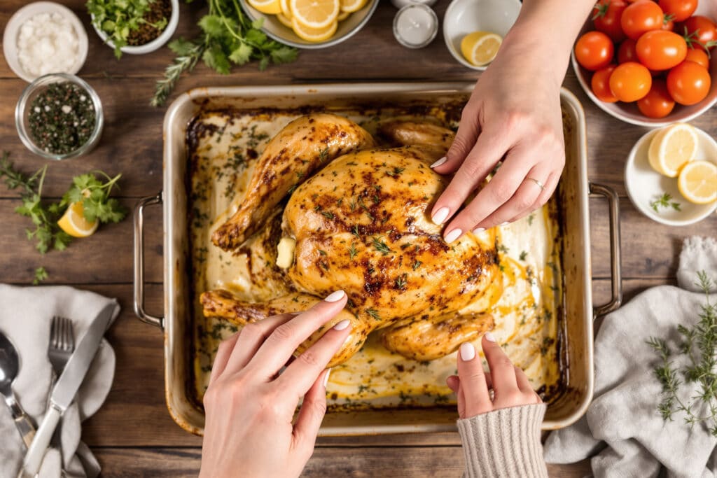 Le petit plus : sortir le poulet du four et le laisser reposer 10 minutes sous une feuille d’aluminium. Cela redistribue les jus et garantit une chair moelleuse.