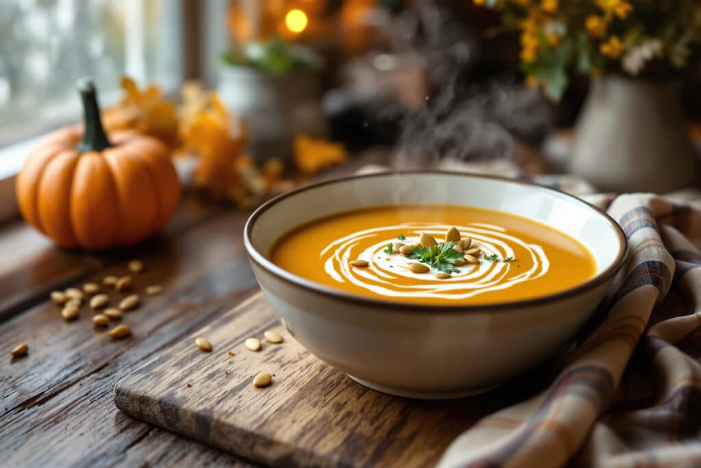 - Textures : Parsemez le velouté de graines de courge grillées, pour le croquant et le parfum toasté.