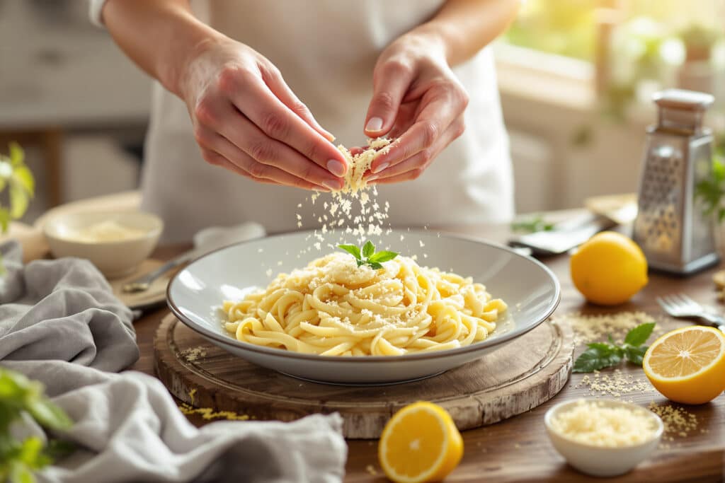 - Choisissez vos ingrédients avec soin. Un vrai parmesan Parmigiano Reggiano fraîchement râpé fera toute la différence en goût et en texture. Préférez un citron bio dont vous utiliserez zeste et jus pour un équilibre subtil. Pour les pâtes, privilégiez des longues pâtes fines, assez fermes pour bien emporter la sauce.